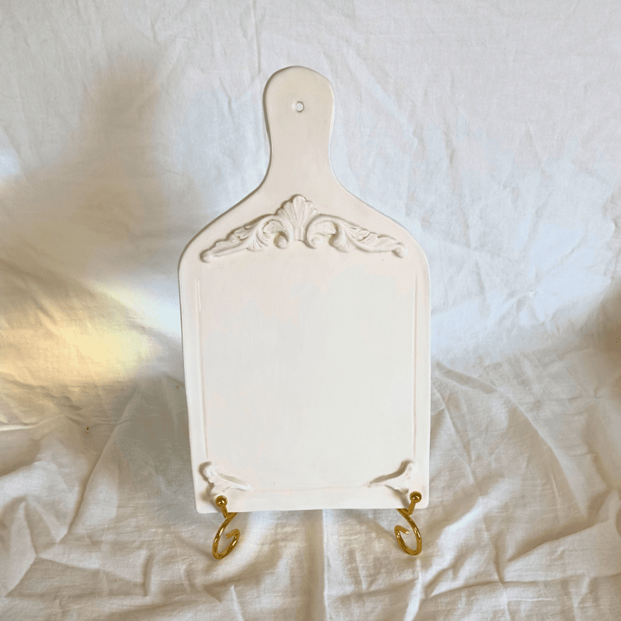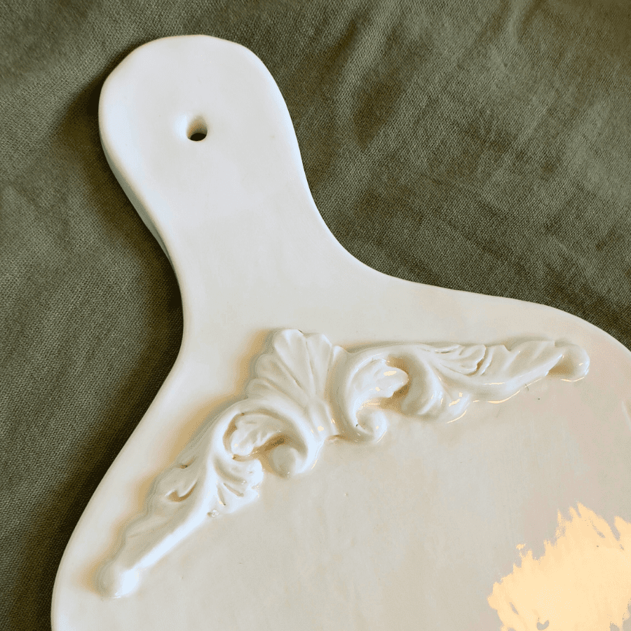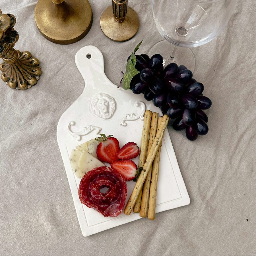 Una pieza que roba miradas y crea conversación. Nuestra tabla de aperitivo de cerámica, con sus delicadas molduras, es perfecta para servir tus picoteos favoritos con estilo.
